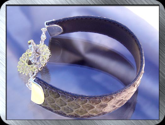 Ssssssssssssexy Sssssssssssumptuous and Sssssssssssssso Ssssssssssssssleek. Snake skin set to a bangle with an intricate Sterling silver wrap clasp. Now - speak snake with me Price: $185