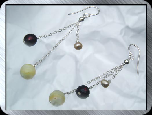 These earrings entrance as they dangle and dance.. The camaraderie of carnelian, quartz and fresh water pearls is undeniable. The cranberry pearl is dipped, dyed, and laser-faceted, transforming a natural pearl into profound layers. Price: $48