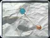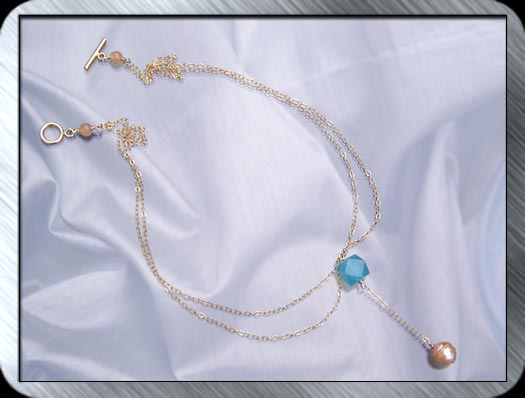 Chalcedony dotted with a gold-dyed faceted pearl--a solitary drop of bliss. Offset by an alluring luster from the double loop of 14K Gold Fill chain that surrounds it. Price: $125 Click below to view matching jewelry and close up photograph: