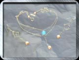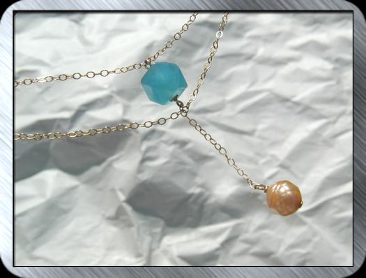Chalcedony dotted with a gold-dyed faceted pearl--a solitary drop of bliss. Offset by an alluring luster from the double loop of 14K Gold Fill chain that surrounds it. Price: $125 Click below to view matching jewelry and full necklace: