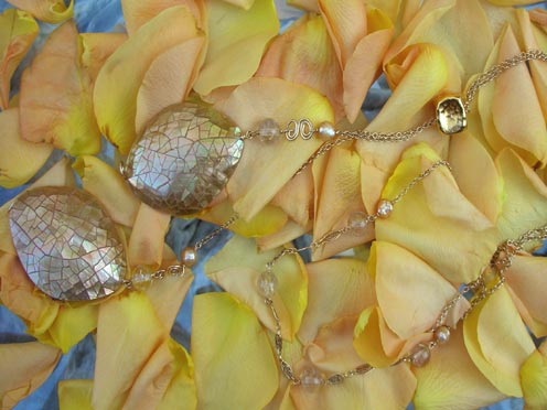 Gold fill, 14 K plate, Mother of Pearl, faceted pearl and rutilated