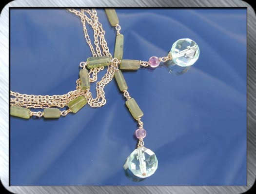 An effortless flow of delicious charms to ornament your neck. Wear long and tie together once, or wrap around twice for a choker. Sumptuous green agate, amethyst and heat treated blue quartz finish off a double strand of 14K Gold fill. Price: $188