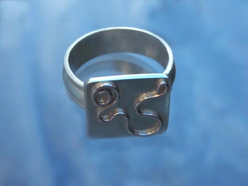 This embellished Sterlilng silver ring is a one-of-a-kind art piece. The band is thick with detail and the swirly face suggests laughter and whimsy.